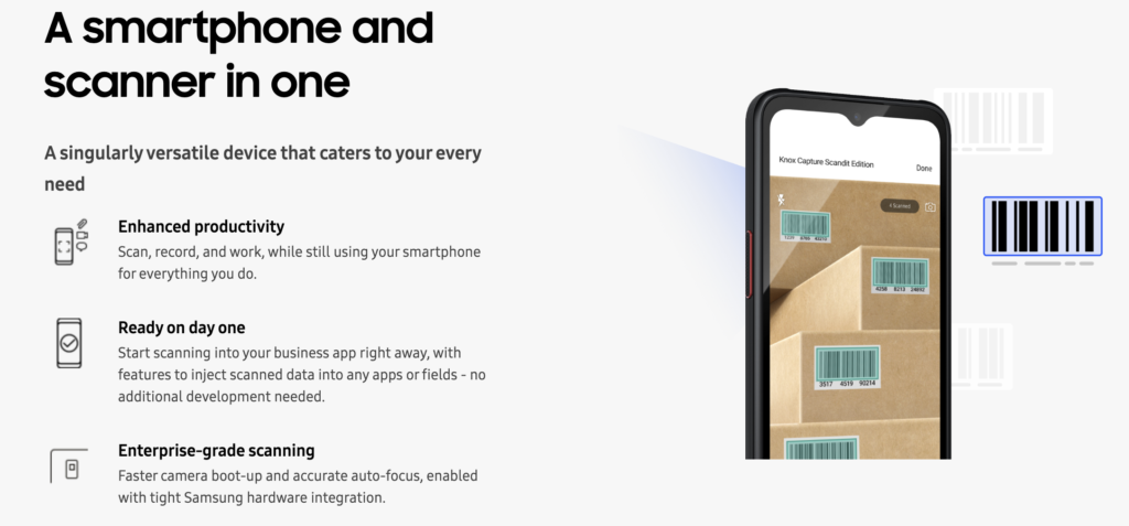 Turn your work phone into the all-in-one solution for your mobile workload with KNOX Capture. Make powerful barcode scanners with easy, customizable UX that allows bulk deployment while saving on operational cost. Samsung phone has ability to transform into a professional-grade scanner that integrate barcode into the application. With Samsung Knox Capture, you can perform all important activities to optimize business digital modernization through one convenient mobile device.